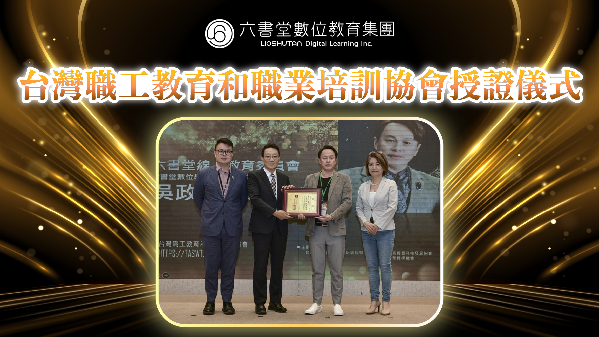 台北市產業發展局長陳俊安(左一)、台灣職工教育和職業培訓協會理事長孔祥科(左二)以及前立法委員李貴敏 (右一) 、六書堂數位學習集團執行長吳政哲(右二)。